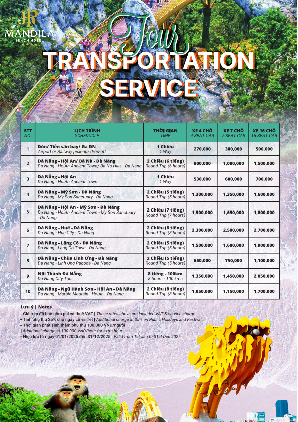 With its romantic ambiance, rich heritage, and welcoming locals, Hoi An offers an unforgettable cultural escape—perfect for a half-day or full-day trip from Mandila Beach Hotel. You can refer to the tour programs and transportation services at the hotel.Getting There: