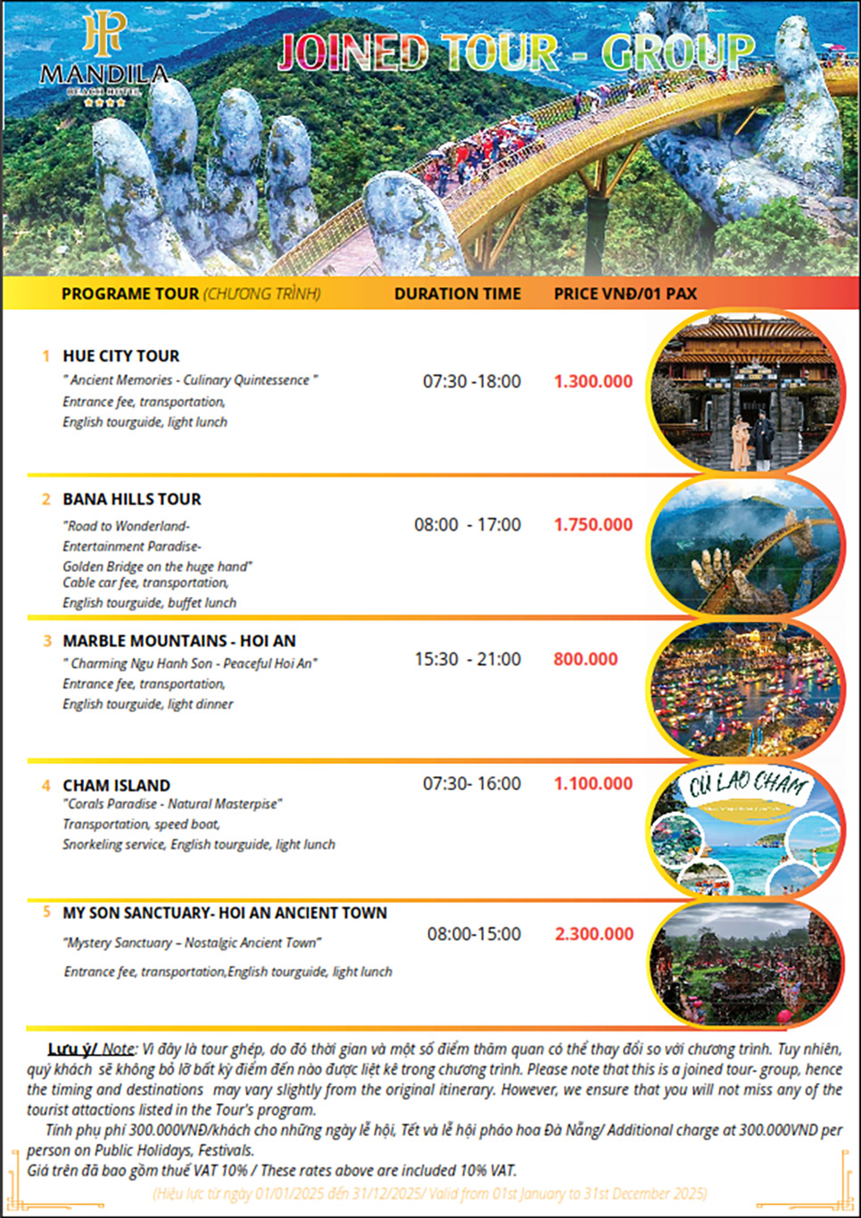 With its magical atmosphere and variety of attractions, Ba Na Hills is an unforgettable day trip from Danang that combines adventure, beauty, and fantasy—all within reach of your stay at Mandila Beach Hotel. You can refer to the tour programs and transportation services at the hotel.